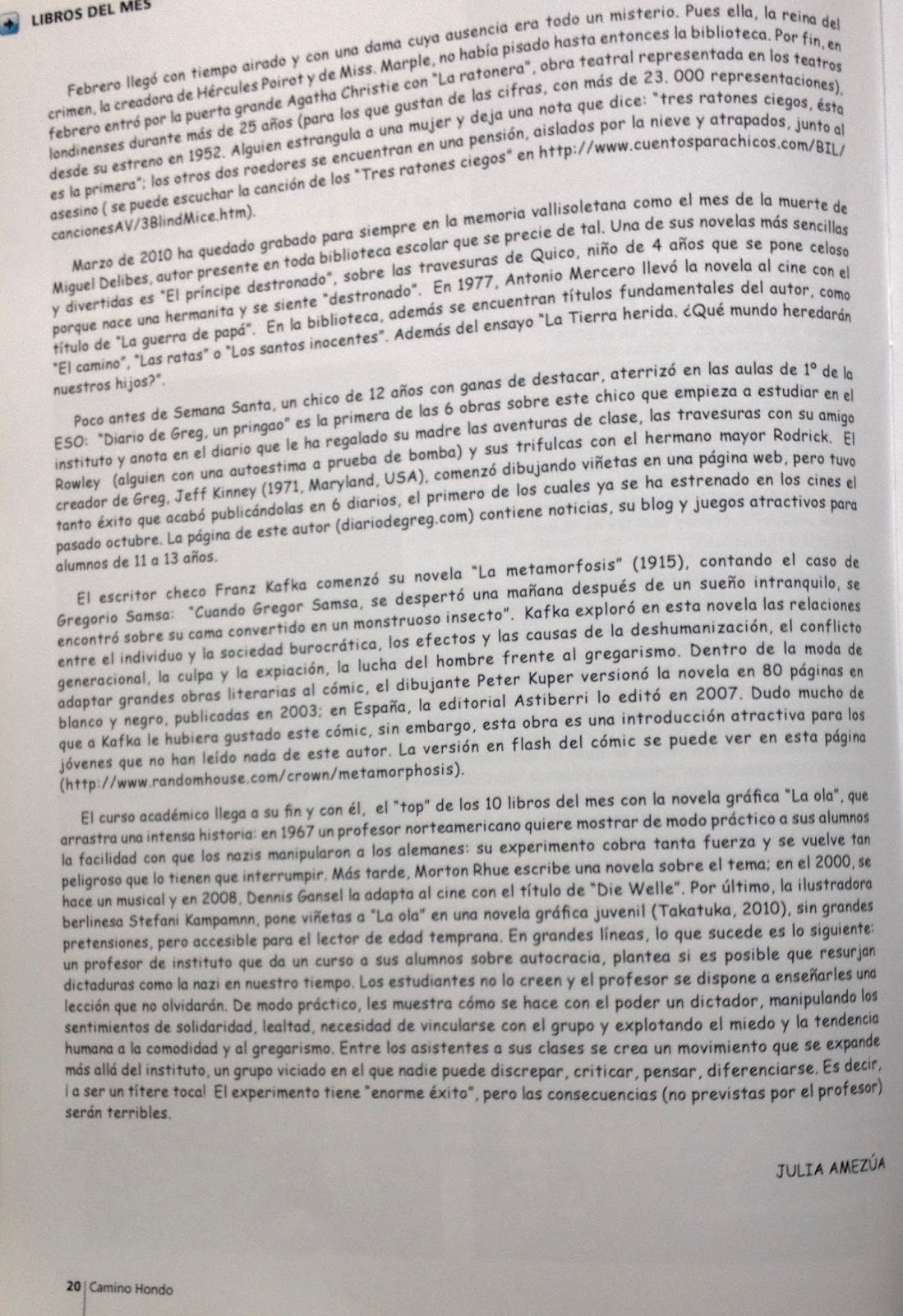 "El top de los libros del mes", por Julia Amezúa en la revista escolar "Camino Hondo", nº 4, junio de 2011, pp. 19-20.